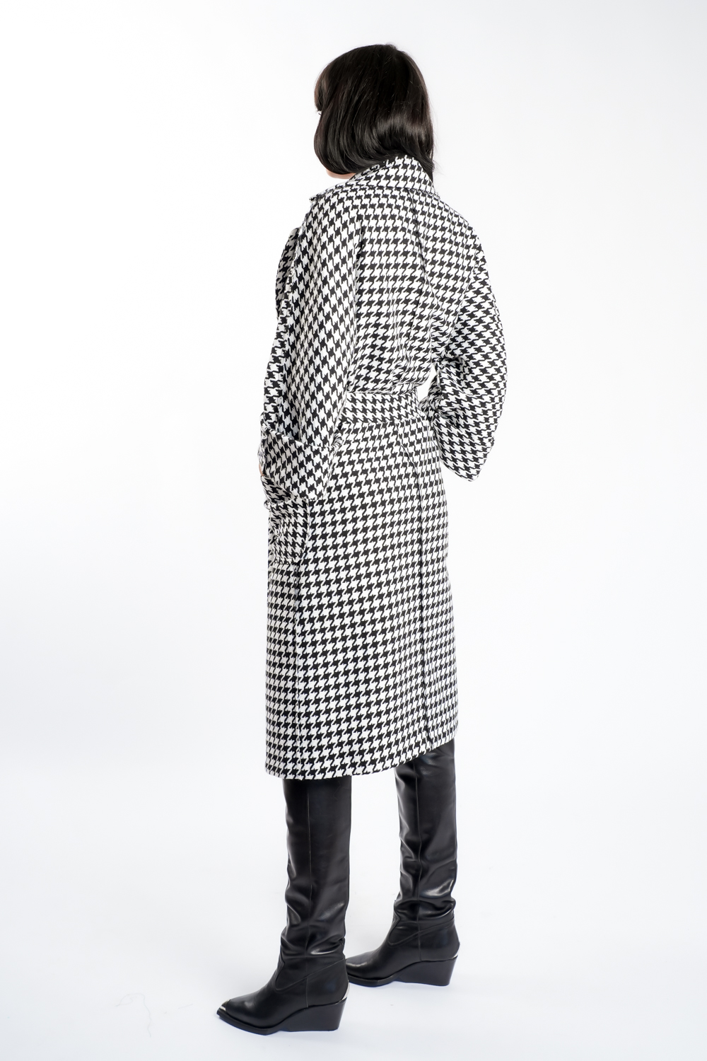 Palton cu croiala ampla, lejer si modern, definit de imprimeul grafic in contrast alb-negru. Designul necaptusit il face versatil si usor de purtat, pastrand in acelasi timp o senzatie placuta de caldura. Cordonul marcheaza talia, iar buzunarele mari adauga un aer relaxat si contemporan. O piesa statement, perfecta pentru zilele racoroase.