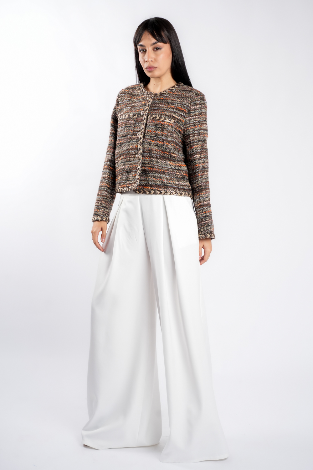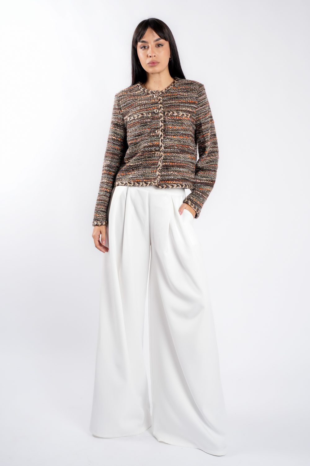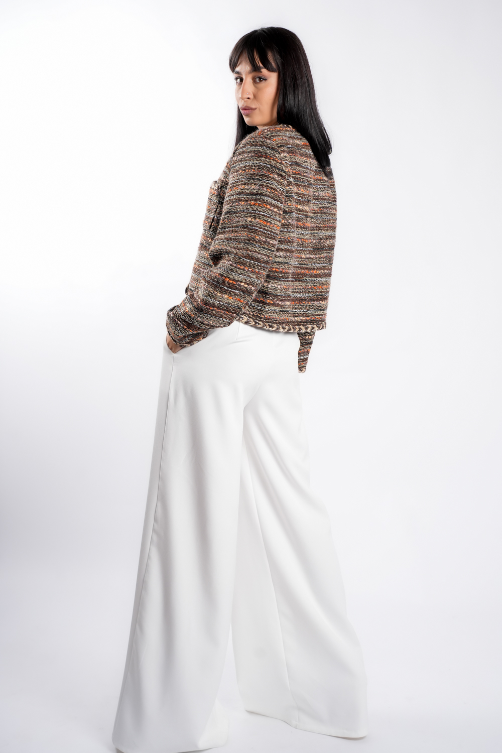 Jacheta scurta, cu textura bogata si nuante calde combinate armonios. Are croiala dreapta si inchidere frontala cu nasturi decorativi, fiind o piesa versatila si confortabila. Se integreaza usor in tinute casual sau smart-casual, adaugand un plus de stil si originalitate look-ului de zi.