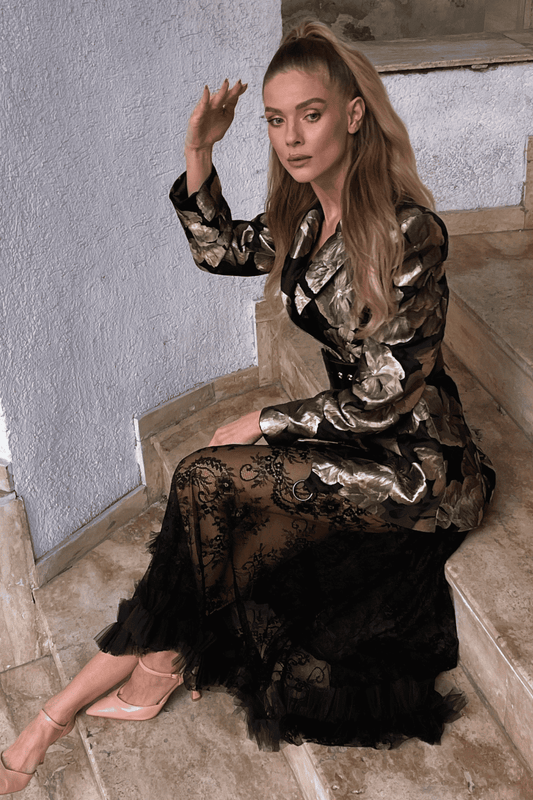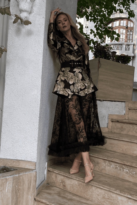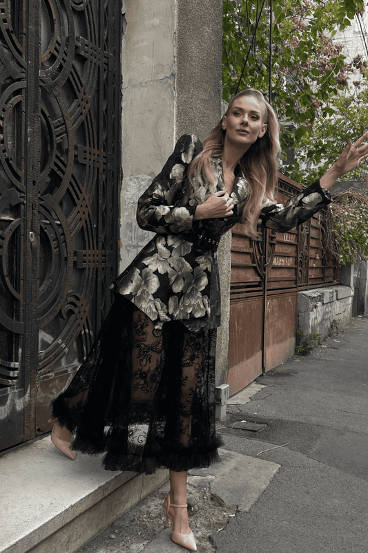 Sacou cu imprimeu editie limitata cu inele și umeri supradimensionați. Știm cât de mult iubești versiunea clasică a rochiei sacou, de aceea ne-am gândit să-ți oferim o reinterpretare a piesei perfecte. Adiția ideală este semi-portjartierul care conferă un plus de eleganță și senzualitate. Umerii supradimensionați sunt accentul potrivit pentru a marca o ținută rafinată. Poartă această piesă deosebită cu tocuri înalte și accesorii detaliate.