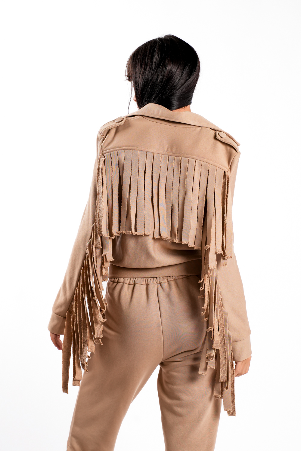Compleu sport cu design modern si accente statement, compus din pantalon cu linie dreapta si jacheta cu franjuri. Franjurile aplicate pe maneci si spate adauga miscare si personalitate, transformand un set casual intr-un look urban cu atitudine.