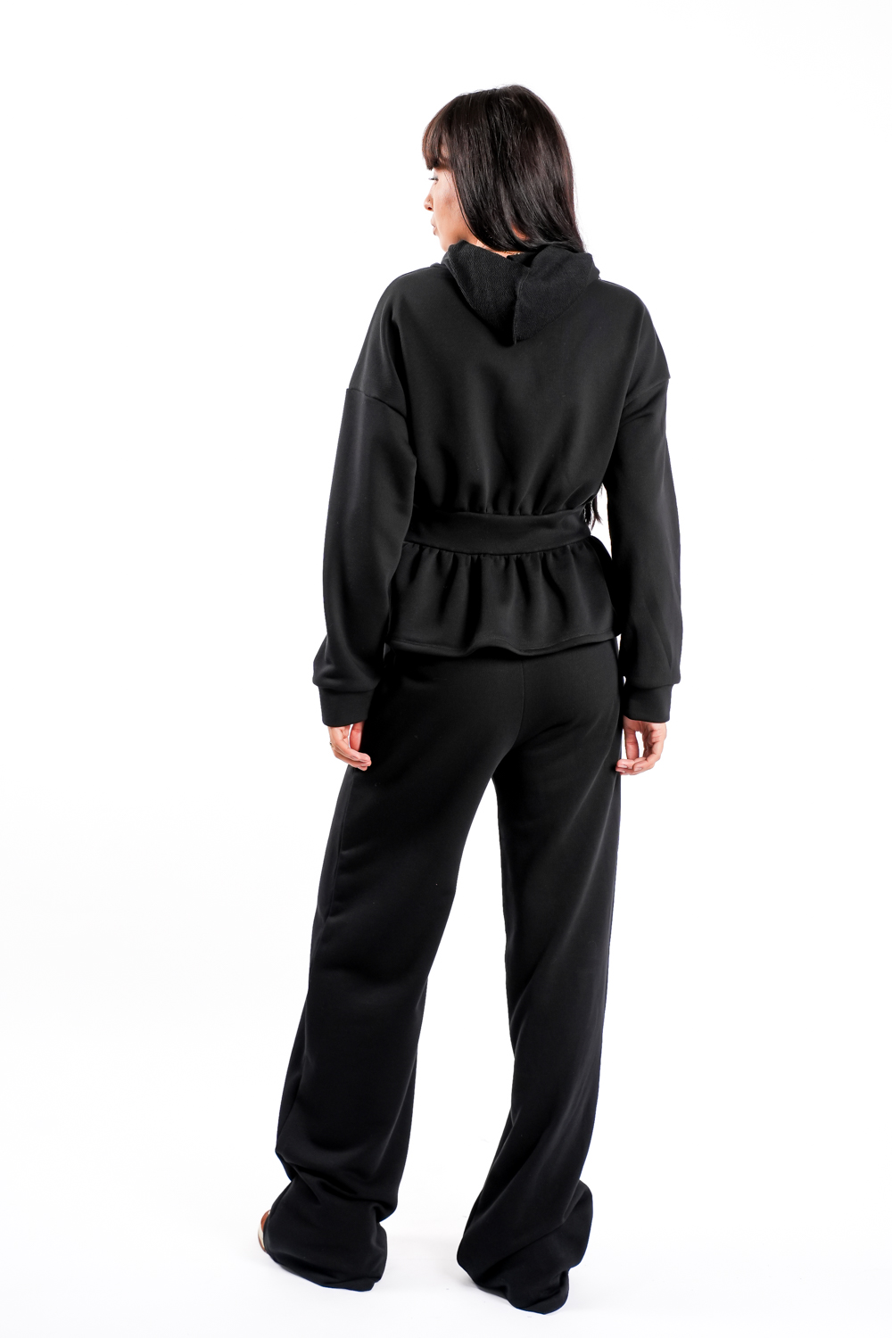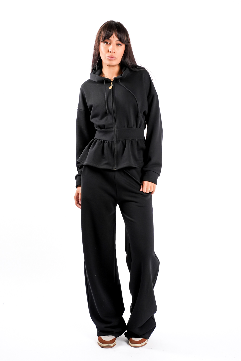 Compleu sport cu design feminin si modern, compus din jacheta cu gluga si talie evidentiata si pantalon lejer cu linie dreapta. Detaliul din talie creeaza o silueta alungita si eleganta, oferind un echilibru perfect intre confort si stil.